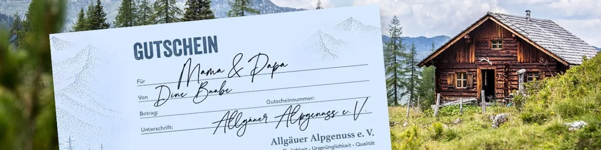Der Gutschein ist auf allen unseren Partneralpen einlösbar und eignet sich ideal als Geschenk für echte Allgäuer Alperlebnisse – privat oder als Firmenincentive. Bitte geben Sie den gewünschten Gutscheinbetrag ein. Zusätzlich zum Gutscheinwert fällt ein Unterstützungsbeitrag von 3,00 € an. Dieser kommt direkt der Vereinsarbeit und der Betreuung unserer Partneralpen zugute. Für den Versand des Gutscheins per Post berechnen wir zusätzlich Versandkosten. Tipp: Statt eines großen Gutscheins empfehlen wir mehrere kleinere Beträge (z. B. 10 €, 15 €, 20 € oder 25 €). Die Gutscheine eignen sich auch hervorragend als Mitarbeitergeschenk, Firmenincentive oder regionale Sachzuwendung im Rahmen von Mitarbeiterbenefits. |